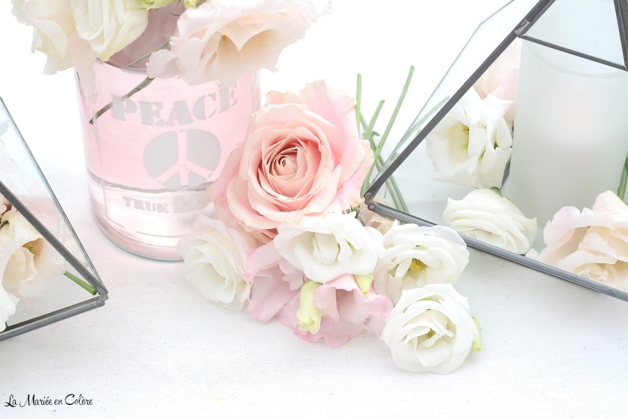 Puisque dans quelques jours c’est la fête des amoureux, je vous propose de créer un joli centre de table de Saint Valentin, qui changera des roses rouges et autres cœurs en origami. Pour cela j’ai utilisé deux terrariums hexagonaux, une bouteille « Peace true Love », des fausses bougies, et de belles fleurs commandées sur le site de France fleurs (Lisianthus et Roses sweet avanlanche). L’idée était donc de sortir des centres de table clichés que l’on voit partout, pétales de roses et chandeliers compris, tout en conservant une ambiance romantique. J’ai préféré opter pour une décoration de table dans des tons pastel, avec de belles fleurs de saison aux couleurs douces : rose et blanc. Après avoir mis les fausses bougies dans les terrariums, j’ai orné l’intérieur avec quelques lisianthus. Le contraste graphique des terrariums tranche avec la délicatesse des fleurs pour un résultat plutôt canon. J’ai orné la bouteille d’eau d’une couronne de fleurs (je vous montre comment faire dans les photos ci-dessous) et voilà, le tour est joué : ça change de ce qu’on voit d’habitude non ?