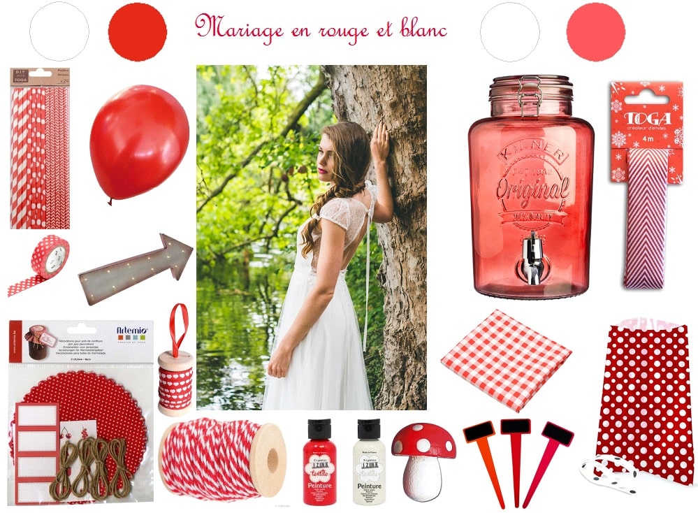 Pailles en papier 3,25 € les 24, Ballon métallisé 7,95 € les 25, Flèche lumineuse en métal 55,90 €, Masking tape 3,40 € les 10 mètres, Kit de décoration pour pots à confiture 5,88 €, Ruban Fantaisie7,29 € les 5 mètres, Bakers twine 3,29 € les 15m, Peintures pour textile 4,35 € les 15ml, Champignons en bois 2,95 € les 24, Piques en ardoise 3,10 € les 6, Nappe de bistrot 19,90 €, Ruban chevrons 4,20 € les 4 mètres, Sachets alimentaires 2,95 € les 12,  Fontaine à boissons 5 litres 29,90 €. Robe de Mariée : Adelin BAUWIN.mariage en rouge et blanc