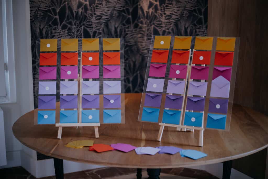 Un thème fullcolor n’est pas un thème inaccessible, loin de là ! C’est un choix qui vous permettra de laisser votre créativité s’exprimer ! Toutes les couleurs s’accordent mais il faut bien les choisir et les associer. Avant toute chose, si vous décidez de vous lancer dans cette aventure, il vous faudra choisir précisément les couleurs que vous souhaitez voir déclinées dans les éléments qui décoreront votre journée. Pour ce shooting, nous en avons choisies six : Jaune, Orange, Rose, parme, Violet et Bleu. Nous avons fait le choix d’un dégradé vitaminé mais vous pouvez choisir des mélanger des couleurs plus douces et pastels qui s’associent très bien entre elles. Mais pour un réel effet colorful, il faut choisir au moins 5 couleurs différentes. Attention, il vous faudra contrebalancer avec des éléments neutres (blanc, transparents, matière brute comme le bois ou le laiton), ainsi vous éviterez les confusions et les effets brouillons.