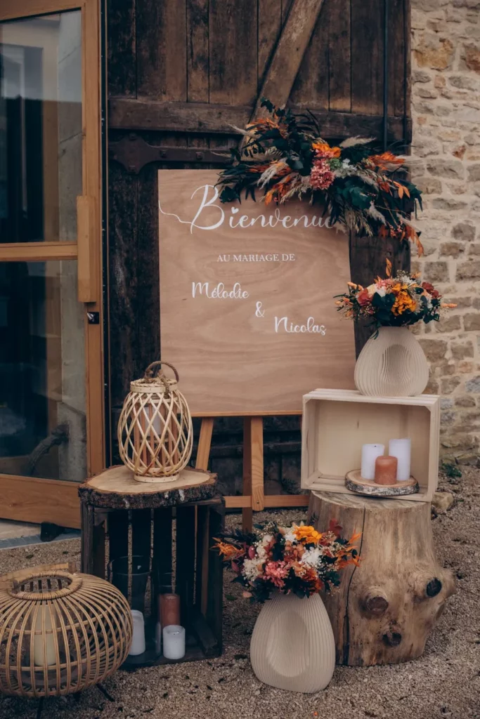 • Décoration automnale sur mesure, avec un plan de table personnalisé et un panneau de bienvenue aux couleurs de la saison.