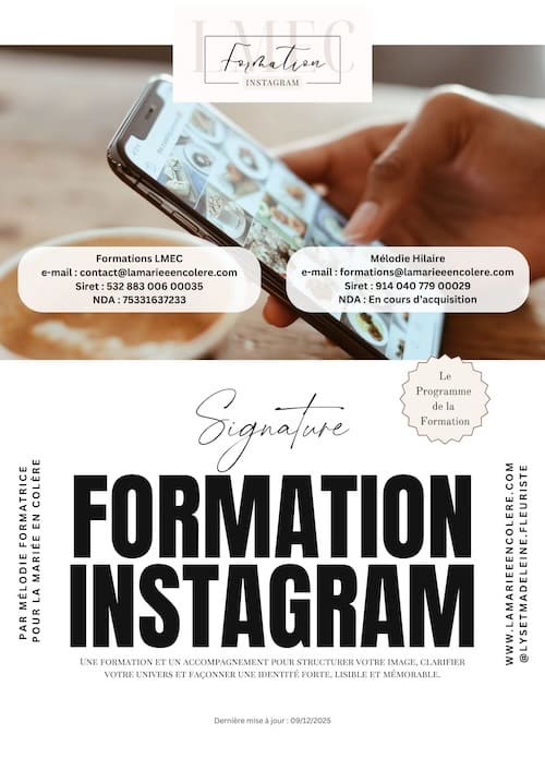 Je suis Mélodie, fleuriste, Lys et Madeleine. Je travaille avec ce que je ressens avant tout. Un détail, une lumière, un rythme suffisent souvent à guider mes choix. J’ai appris à faire confiance à mon intuition, à oser des partis pris, et à construire une identité qui me ressemble profondément. À travers cette formation Instagram, j’ai envie de transmettre cela aux professionnels du mariage : l’audace d’être soi, l’attention portée à chaque détail, et la liberté de créer une présence sincère, reconnaissable, vivante.