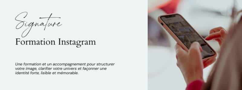 POUR QUI est cette formation ? Cette formation s’adresse aux prestataires du mariage qui : L’accompagnement « Signature » formation INSTAGRAM C’EST QUOI ? Un accompagnement en visio, en direct, pensé pour les entrepreneurs du mariage qui souhaitent : C’est un espace d’ajustement, de précision, et de stratégie, pour : Signature, la formation INSTAGRAM, c’est un accompagnement de 5 jours, en petit groupe, avec retours