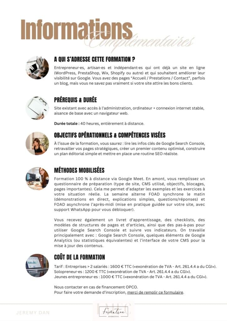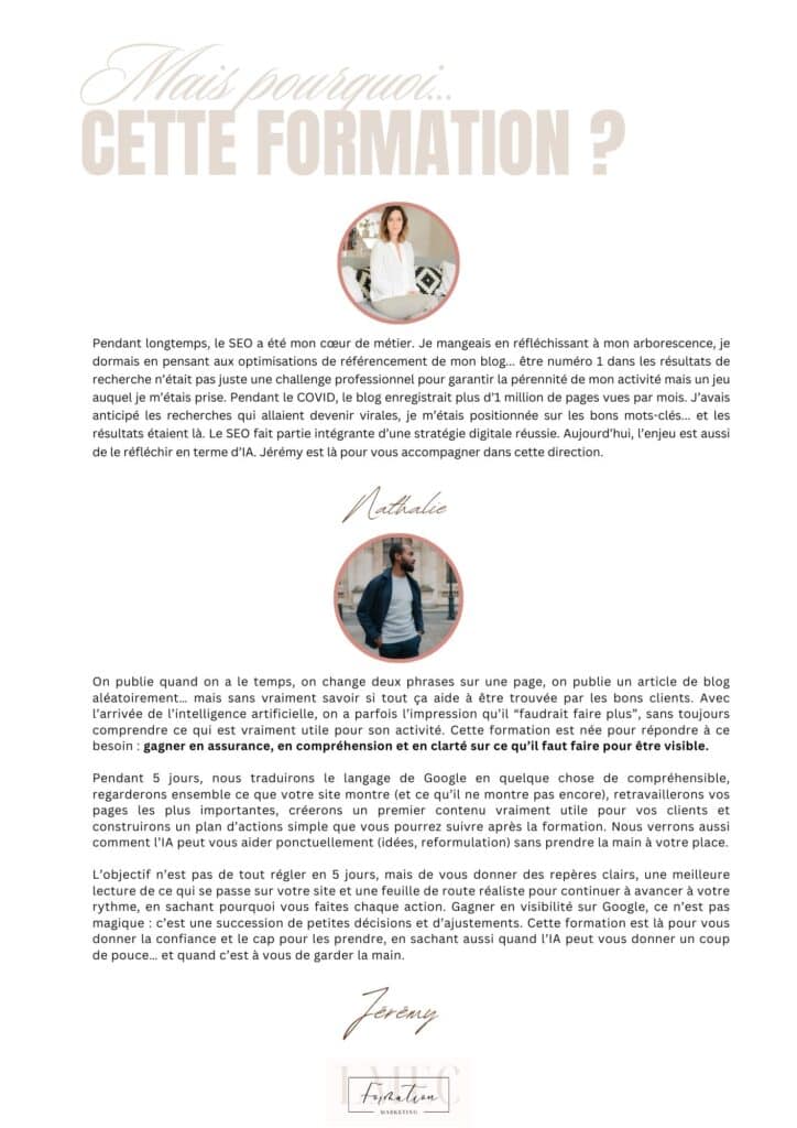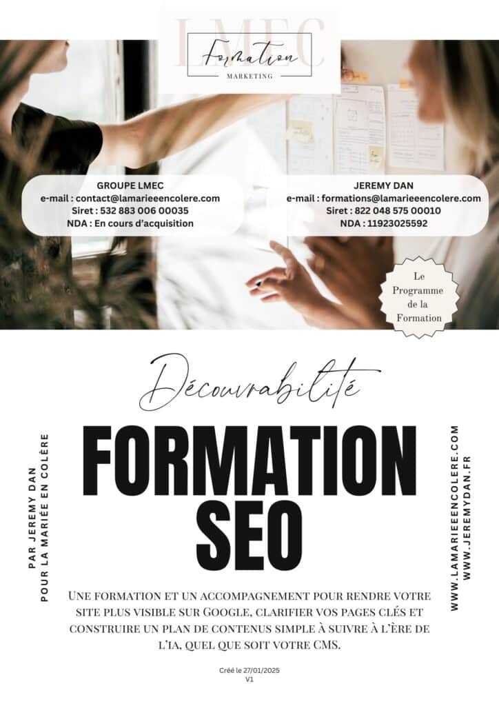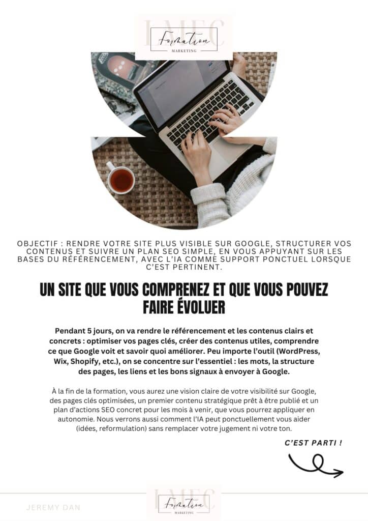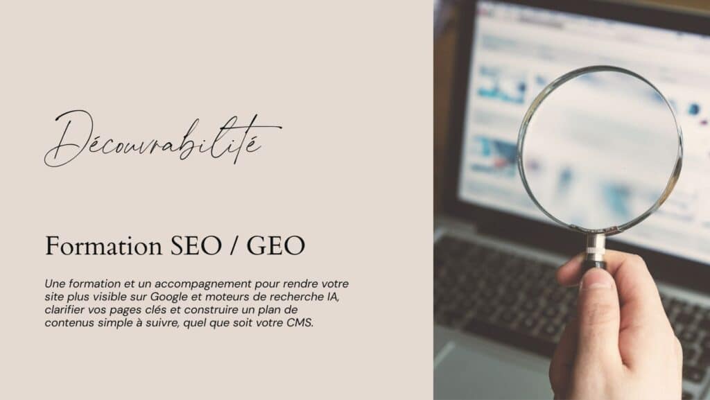 J’ai donc créé cette formation pour leur donner un cadre : des explications simples, des exemples concrets, et surtout du temps accompagné pour travailler sur leur propre site. L’objectif n’est pas de devenir experte SEO, mais de savoir où regarder, quoi améliorer en priorité, et comment avancer sans dépendre de quelqu’un d’autre.
