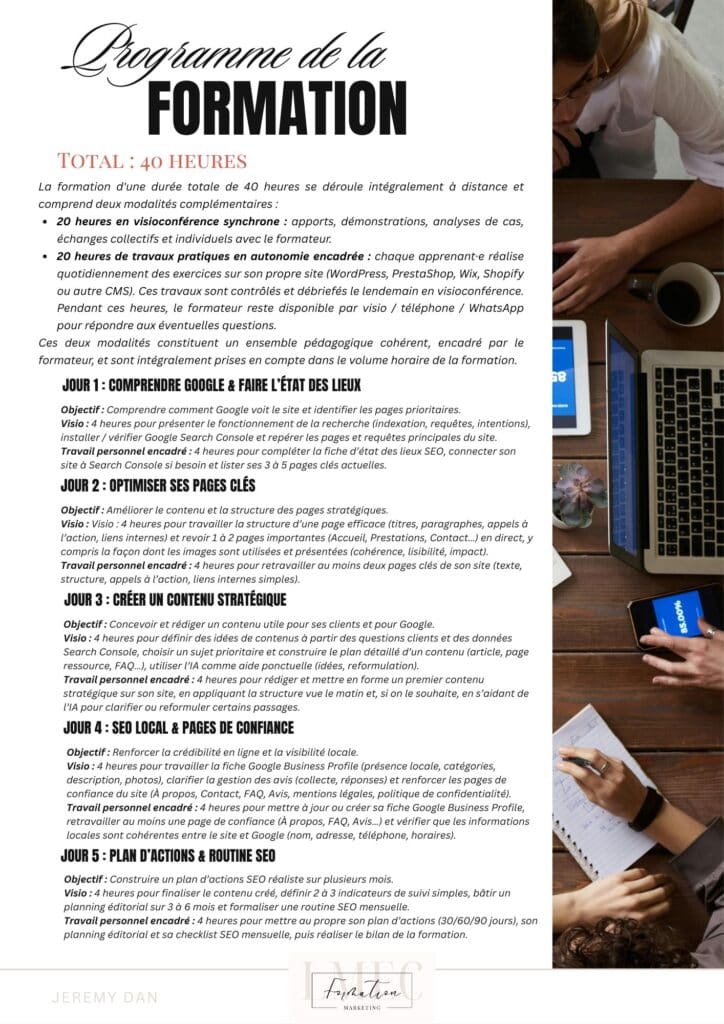 5 jours de formation en visio le matin — explications, démonstrations, analyses de cas sur les sites des participant·es — et des après-midi de mise en pratique sur votre propre site.