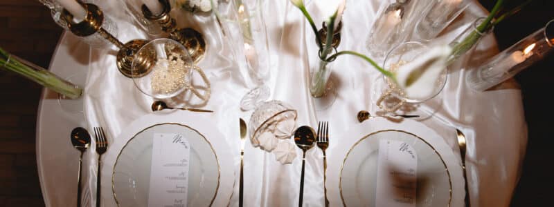Chemin de table, jolie vaisselle (que vous pouvez louer si votre traiteur n’a pas ce que vous souhaitez, comme des couverts dorés par exemple : la grande tendance en ce moment), centres de table mariage, vases, bougies, compositions florales, petits cadeaux pour les invités… là aussi tout doit être raccord à votre thématique. Sur le blog, vous trouverez de nombreuses idées pour décorer une table de mariage qui vous serviront autant pour votre D-DAY que vos fiançailles.
